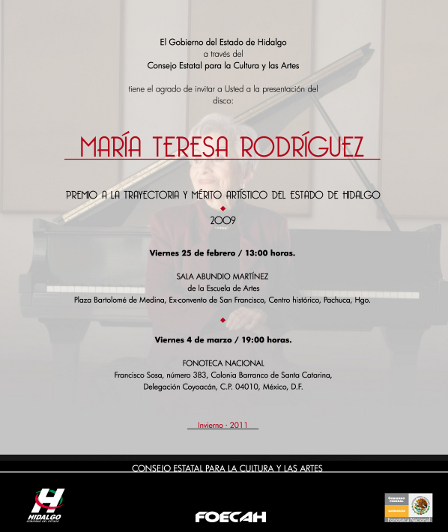 Presentaran Álbum discográfico de la pianista Hidalguense Maria Teresa Rodríguez Pachuca, Hgo., 19 de Febrero del 2011.- Tras haber sido distinguida con el Premio a la Trayectoria y Mérito Artístico en mayo de 2009, el Gobierno del Estado de Hidalgo a través de su Consejo de Cultura, presentará el material discográfico homónimo de la prestigiada pianista hidalguense, María Teresa Rodríguez, el próximo viernes 25 de febrero a las 13:00 horas en la Sala Abundio Martínez de la Escuela de Artes del CECULTAH. Esta compilación musical es un testimonio amplio y diverso del desempeño profesional de la maestra Rodríguez, en el cual, se podrán apreciar antiguas grabaciones en vivo que se lograron rescatar de cintas magnéticas de recitales y conciertos que interpretó entre 1970 y 1994.