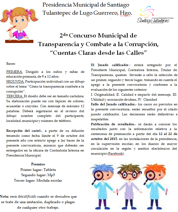 La convocatoria señala que los participantes deben plasmar a través de un dibujo, el combate a las malas prácticas entre población y gobierno, con el objetivo de fortalecer la cultura del combate a la corrupción por medio de los valores entre la población infantil y las familias santiaguenses, contribuyendo a la formación de ciudadanos responsables de su actuar frente a la sociedad. Lira Juárez, mencionó que los criterios a evaluar serán: originalidad, calidad e impacto del mensaje, utilidad y asociación de ideas, así como claridad; los dibujos que deberán ser en tamaño cartulina, habrán de entregarse a más tardar el 9 de octubre en la oficina de Contraloría Interna al interior de Presidencia Municipal. Finalmente la titular del área informó que a partir del 12 de octubre, se darán a conocer los tres primeros lugares del concurso local quienes serán acreedores a premios en especie y representarán al municipio en el concurso estatal que organiza la Secretaría de Contraloría y Transparencia Gubernamental. Concluyen festejos de la Independencia con saldo blanco en Santiago Tulantepec En Santiago Tulantepec listos los detalles para los festejos del Día de la Independencia Jesús Alberto Aguilar Hernández entrega su 4° Informe de Gobierno de Santiago Tulantepec