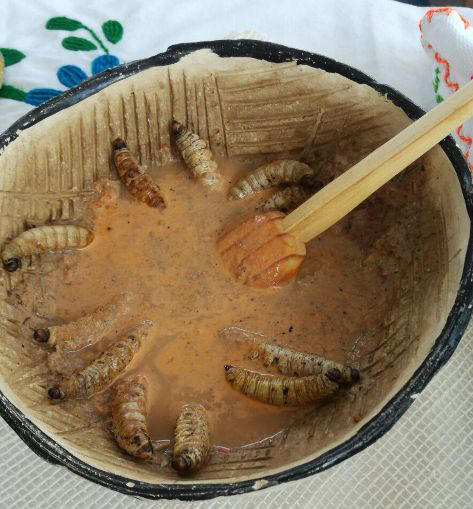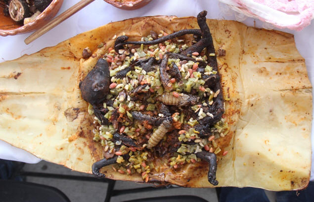 sus platillos exóticos, como gusanos, flores y animales